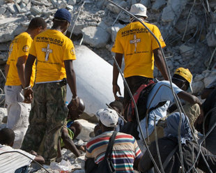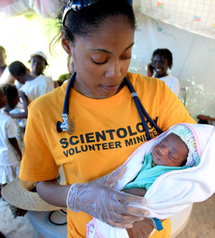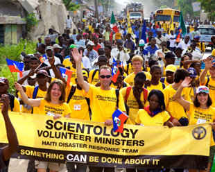 Blant de første nødhjelpsarbeiderne som strømmet til fra hele verden for å komme det ødelagte landet til unnsetning, var 350 frivillige scientologiprester. Scientologene chartret straks et fly fra New York til å transportere leger, sykepleiere og medisinske teknikere til Haiti sammen med frivillige prester til å støtte legene og andre som hadde behov for hjelp.